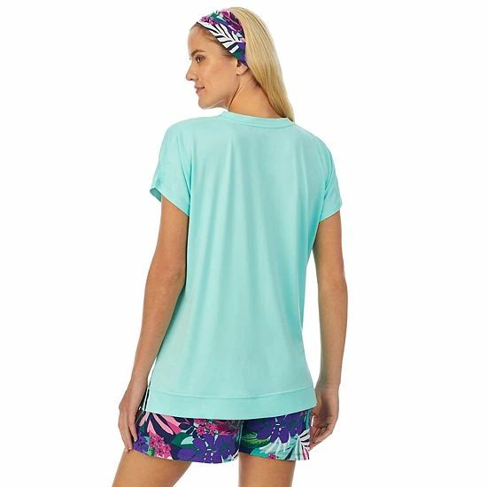 - Top: V-neck with dolman short sleeves, 4″ side slits at hem, side ruching